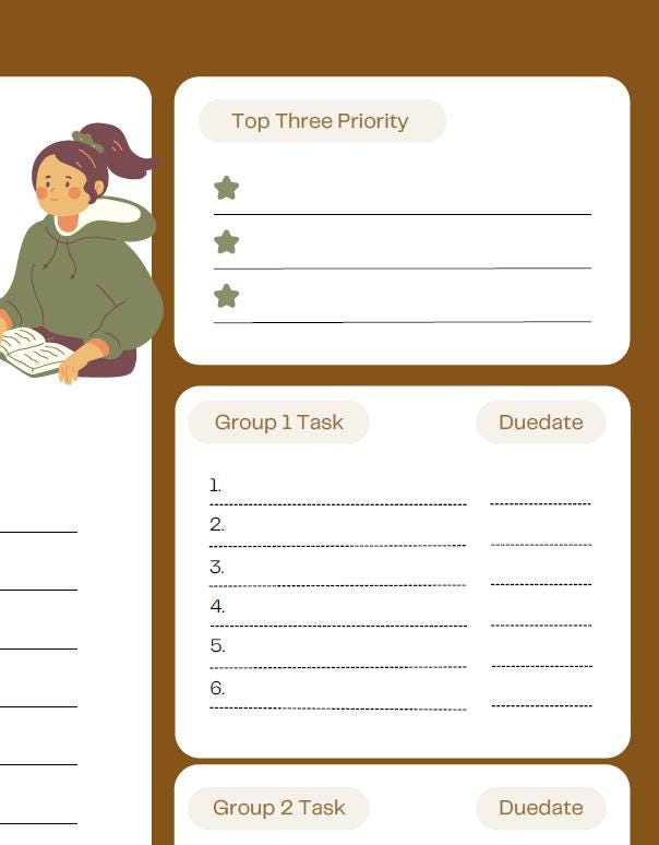• Includes Chores, Top Three Priorities, Group 1 Tasks, Group 2 Tasks